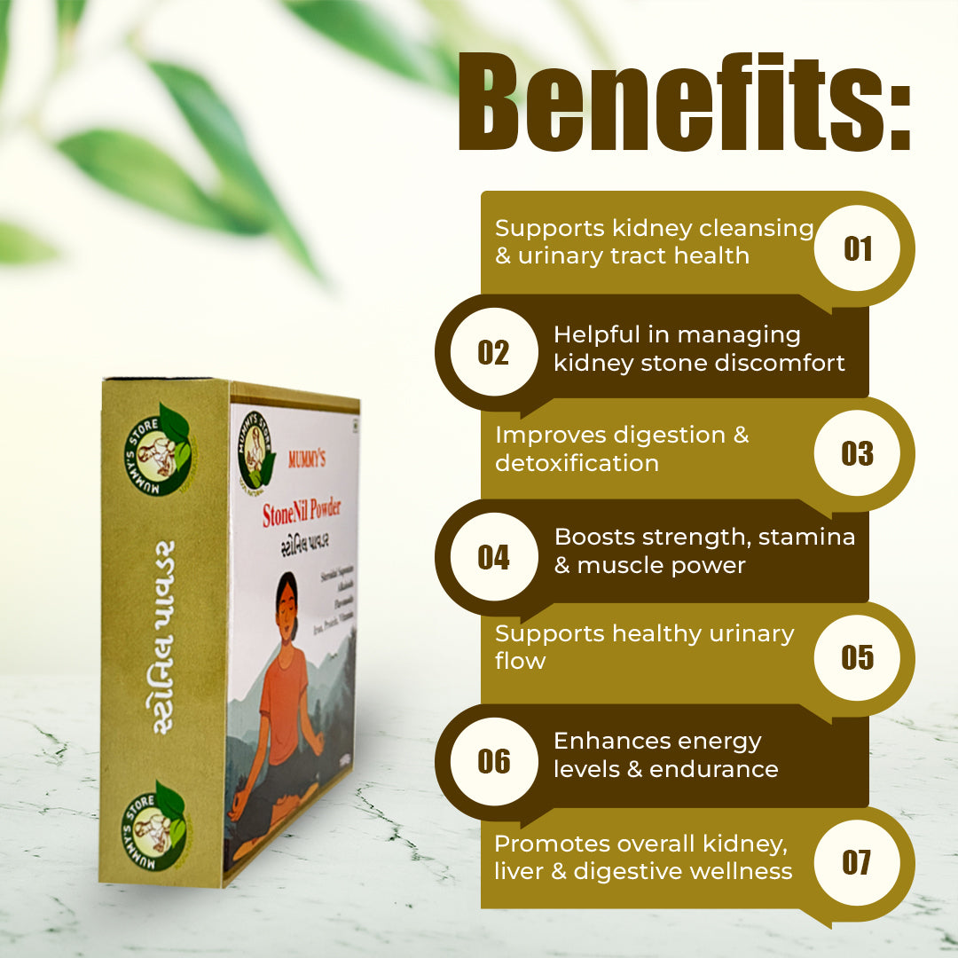 Mummy’s StoneNil Powder is an Ayurvedic herbal blend formulated to support kidney & urinary tract health, promote detoxification, and maintain a clean urinary system.